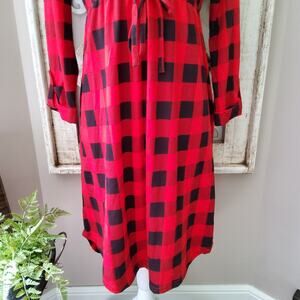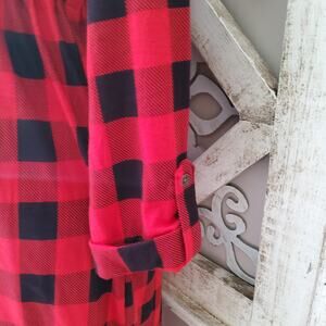 Red and white Buffalo plaid checked 3/4 sleeve, collard v-neckline elastic waist dress by Times Two Maternity in a size small.