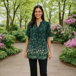 Embrace effortless elegance with this Timeson Women’s Size Large Green Floral Blouse. Featuring a soft chiffon overlay with a delicate white floral print on a rich emerald green background, this top blends feminine charm with a flowy, flattering silhouette. The flutter sleeves and ruffle-trimmed V-neckline create a romantic, easy-to-wear style that transitions beautifully from work to weekend.