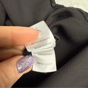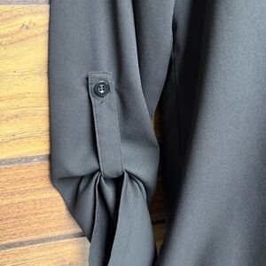 This black blouse features a relaxed fit with V neckline . The design offers a comfortable and chic look, perfect for both casual and formal settings.