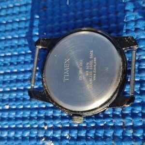 Timex analog watch with a black face and white numerals. Classic design with a date Without band,new 10 year battery installed,has light surface scratch on face