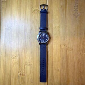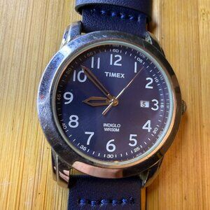 Excellent condition! Runs great with a brand new battery. Minimal cosmetic wear. This model has a navy blue genuine leather bracelet and a silver stainless steel case and bezel. The dial is a metallic navy blue color with white accents and a calendar indicator wheel. Water resistant to 50M/165 feet/5ATM. Indiglo backlight. Box not included