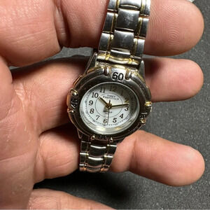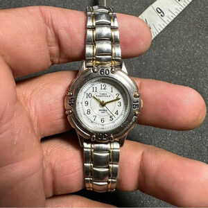 Timex Essentials Indiglo Ladies Quartz Watch Silver Gold Tone White Dial Working shows signs of wear such as light scratches on case band and crystal see pictures for reference