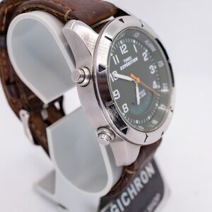 The 2000's Timex Ana/digis came in many sizes and colorways, but more uncommon is the heavy duty version - sporting a 42mm x 12mm case size (instead of the typical 38mm x 10mm), and fitted with the classic holographic finish on the LCD, this is a wonderful example of these bigger models. This item shows light signs of wear on the case and crystal and is fitted with its original expedition branded strap (the leather has aged wonderfully).