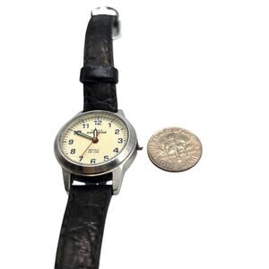 Band: Genuine leather black strap, 12mm lug width as indicated on case back. Original buckle clasp.