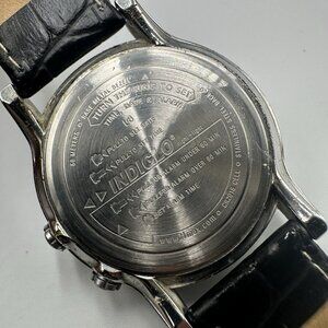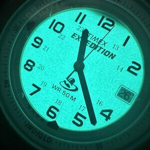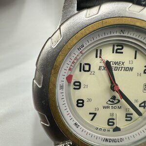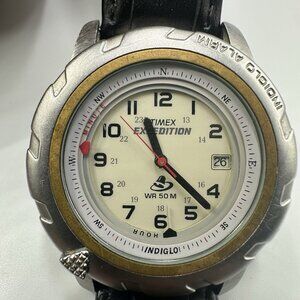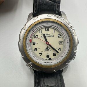 Timex Expedition Watch Men Silver Tone Indiglo Alarm Black Leather Band Works 9"