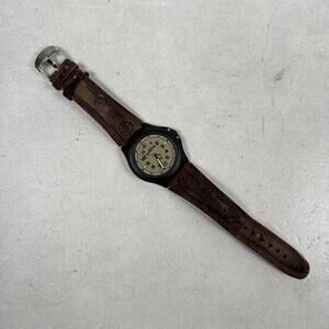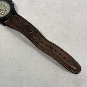Condition: Good used condition with visible wear and notable distress on the genuine leather band. Some surface wear and discoloration on the strap as shown in photos. Watch face and case show minor wear, no major dings or cracks seen. Crystal appears clear. See all pictures for detailed views of strap wear and case condition. Watch is working and has a brand new battery.