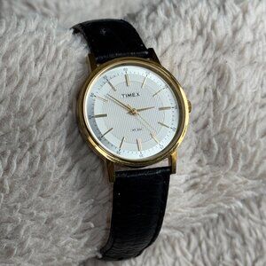 Timex analog watch featuring a gold-tone case, a textured white dial, and a black leather strap. Stainless steel back, water-resistant, and marked Timex India on the strap.
