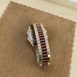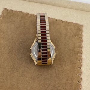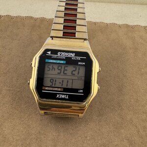 Timex Indiglo Digital Men’s Gold Tone Alarm Chrono Quartz Watch in great condition. Has a new 2016 Battery and all the functions work so it’s ready to go. The face has a few light surface scratches from regular wear. It features a gold-tone bezel and Custom Stretch band with Inlay Garnet color Inserts, Has a gray digital dial showing the time, date, and other functions, including backlight, alarm, and 12-hour display. Both the band and Back are stainless steel, making it a great everyday watch. 2016 FA