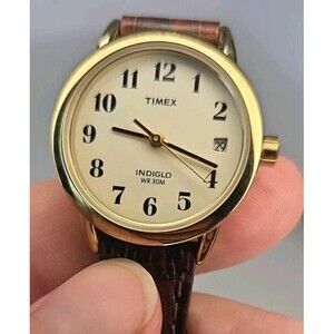 Timex Indiglo Watch GoldTone 25mm Date Brown Leather Strap WR 30M Womens Classic