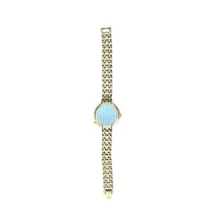 This Timex Indiglo wristwatch for women features a striking gold tone stainless steel bracelet with a jewelry clasp closure and a polished case finish. The watch has a round white dial with Arabic numeral indices and a fixed gold tone stainless steel bezel. It is water-resistant up to 30 meters (3 ATM) and includes a backlight feature. The watch is powered by a quartz movement and has a snap caseback. It measures 7mm in case thickness and has a lug width of 12mm. The watch is not vintage and does not come with papers, service records, or original box/packaging. It is a casual style watch suitable for everyday wear.