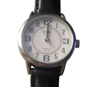 Timex Ladies Indiglo White Dial Silver Trim New Battery Leather Band Vintage