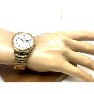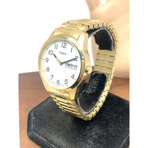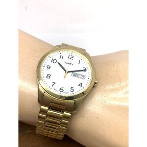 Timex Men's Watch T2N064 Quartz White Dial Day Date Indiglo Gold Expansion Band