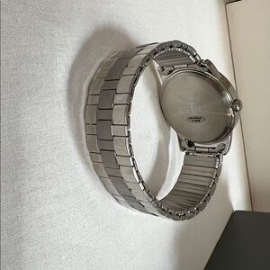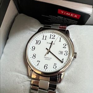 Elegant Timex watch with a sleek silver bracelet. Features a classic white face with date. This watch appears to be NIB and if ever worn, had to have been very little. We find no scratches on crystal, watch, or the band. Very excellent shape.