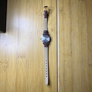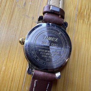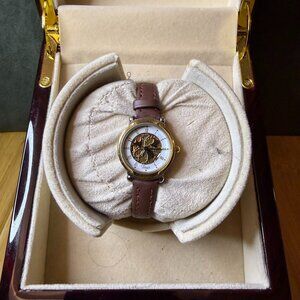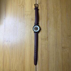 Excellent condition! Runs perfectly with a brand new battery. Minimal cosmetic wear. This model has a brown genuine leather band and a gold and silver tone case. The dial has a white border with black Roman numeral accents, and a skeleton middle section that reveals an intricate gold tone pattern. Box not included