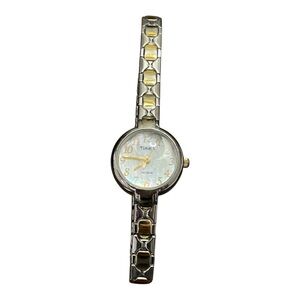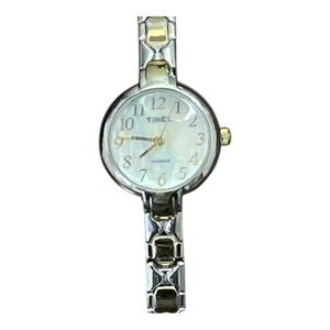Stylish Timex women's watch with a two-tone design. Mother of pearl style face with Indiglo. Features a round face and elegant look.