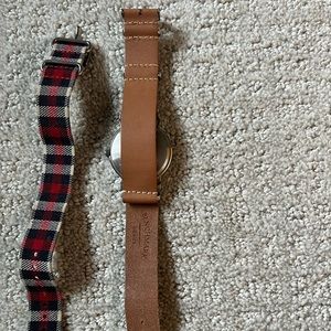 Analog timex watch with two interchangeable bands. Faux leather and plaid fabric band. Some scratches on the back of the watch. See picture.