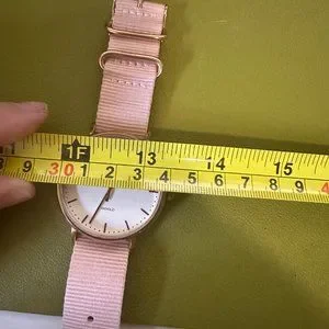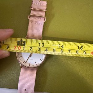 Timex rose gold watch with white dial and light pink fabric strap; case and strap in great condition