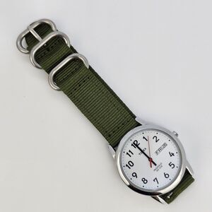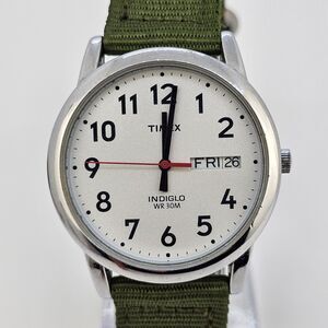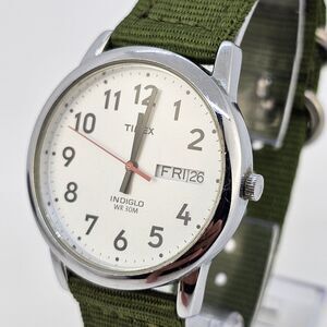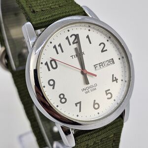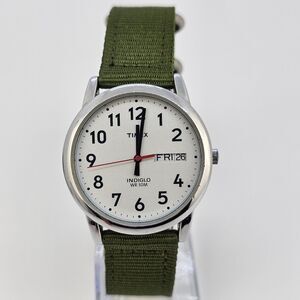 Timex Watch Men 35MM White Dial Day Date New Army Green Canvas Bands New Battery