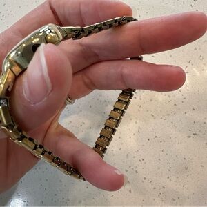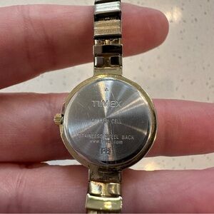 Stylish Timex watch featuring a gold band and white dial. Ideal for everyday elegance. Features a stretchy band for easy wear. Good used condition-NEEDS A BATTERY, the face looks a little cloudy to me in person. Measurements in photos.
