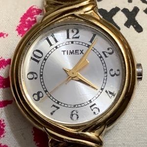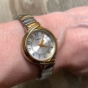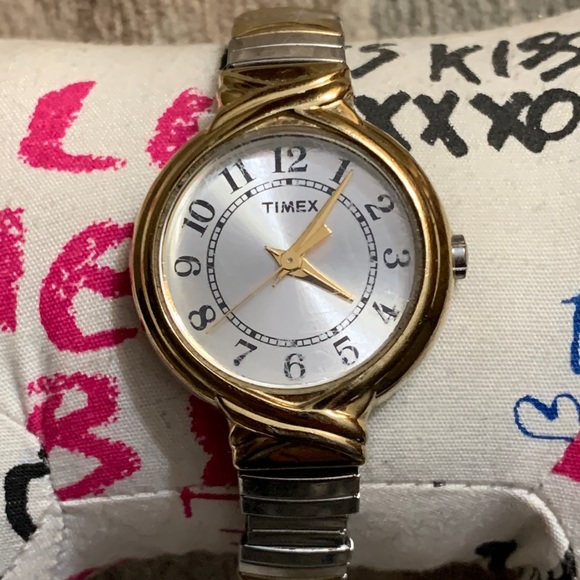 Vintage Timex watch with a stretchy band. Needs new battery. Good used condition with signs of normal wear & tear and some minor scratches on the face.