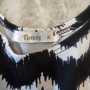 Make a statement with this bold and flattering chevron print top from Timing. Features an elastic waist for shape and a snap bottom for secure wear. Black and white zigzag pattern adds a trendy graphic pop. Size XL. Great for layering under jeans, blazers, or skirts. Excellent pre-owned condition.