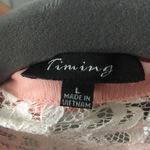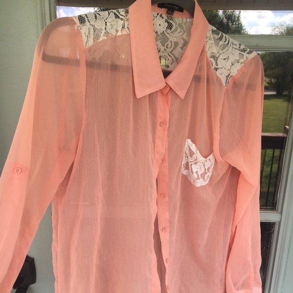 This blouse is very pretty. It is sheer and accented with lace. It’s in good condition. Has one very small place on the back that looks like maybe an oil stain. Barely noticeable.