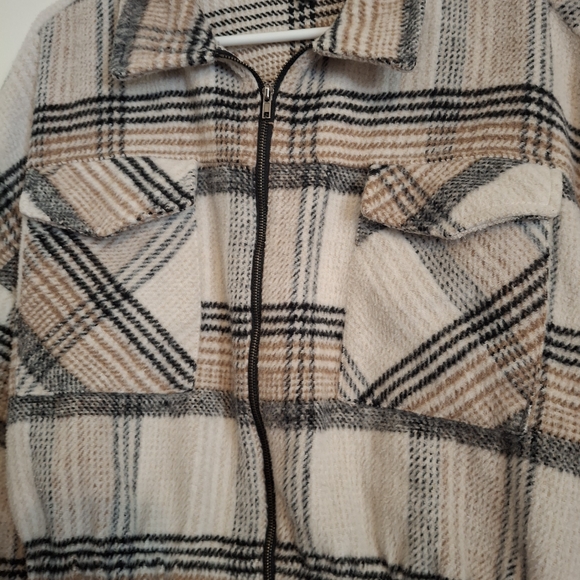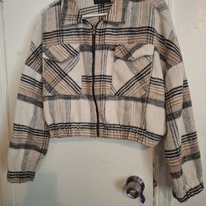 Chic jacket with a checkered design. Features a blend of black, tan, and cream colors.