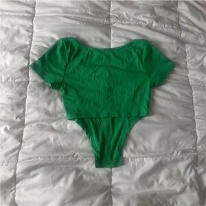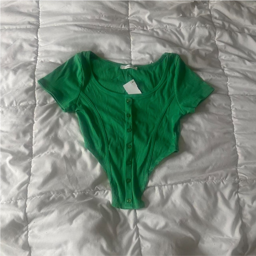 Elevate your style with this chic green button-up upside down triangle v-shaped crop top. Perfect for any occasion, this top offers both comfort and elegance.