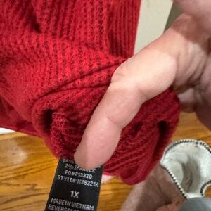 Vibrant red shirt with a textured design. Features button-up front and stylish pockets. PTP 24-26. Length 43 1/2 inches. Never been worn new with tags