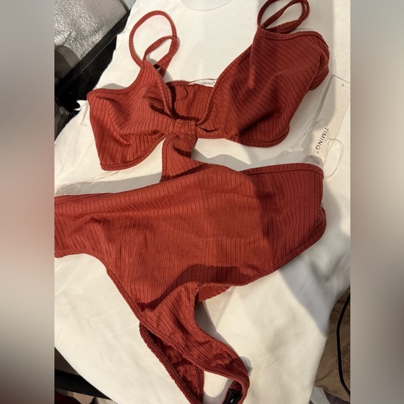 Stylish rust bikini set by Timing. Features ribbed texture and knot detail. Perfect for beach days.