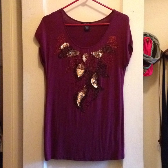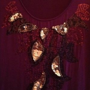 This purple top is 65% polyester, 35% rayon with sequins in shades of gold and brown. Worn just 1-2 times.