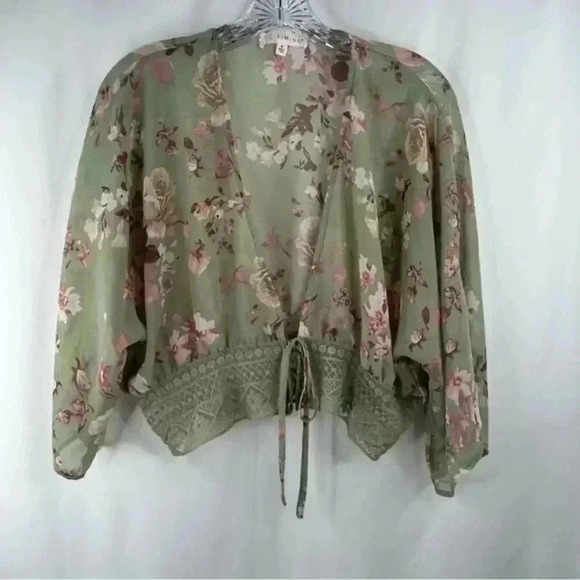 Timing Sheer Olive Green Floral Tie Front Blouse 3/4 Sleeves Lace Accent Size M