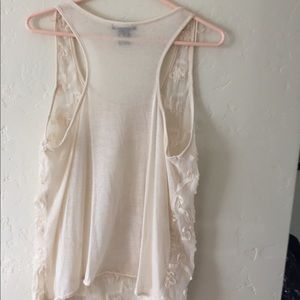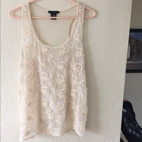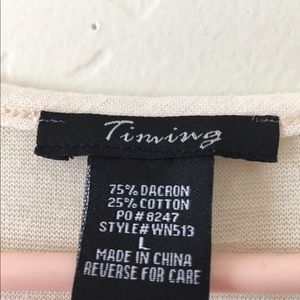 Timing Top Cream color size L pit to pit 17” Length 25” Razor back cut Fabric: 75% Dacron, 25% cotton.