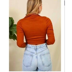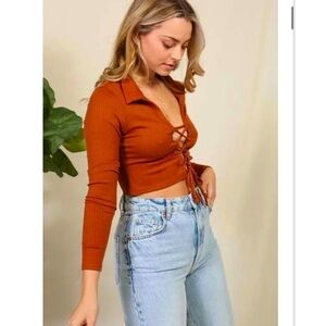 Timing Women's Cognac Red Brown Long Sleeve Crop Top with Corset Style Front
