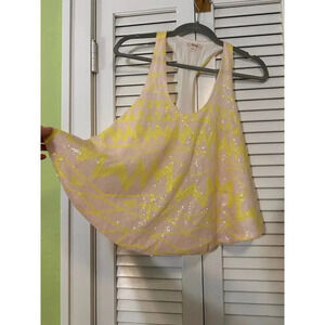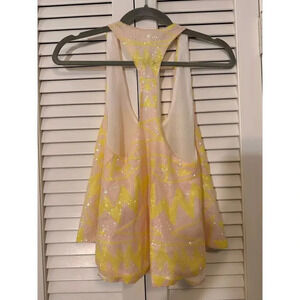 Add some sparkle to your wardrobe with this Timing Women's Sequin-Embellished Racerback Tank Top. Featuring a vibrant yellow and pink geometric pattern with shimmering sequins, this top is perfect for making a statement. The lightweight, flowy design and racerback cut make it ideal for warm weather or layering under a jacket for a night out. Made from 100% polyester, this top is comfortable and easy to care for. Available in size S, it's a chic choice for casual outings or festive events where you want to shine.