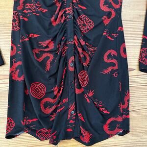 Timing black red Asian print long sleeve button down ruched dress SIZE L