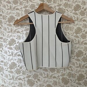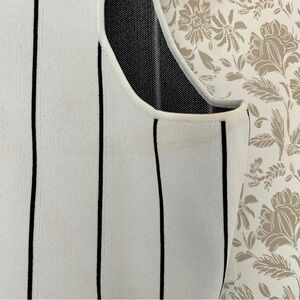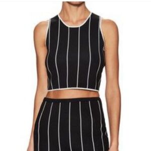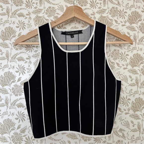 Chic and structured Timo Weiland crop top in size XS with black and white vertical stripes. Front is black with white stripes, back is white with black stripes—super cool reversible look! Thick knit fabric, high-quality construction, perfect for pairing with high-waisted trousers, skirts, or jeans.