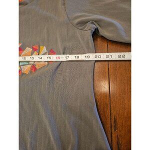 This blouse tells a story of creativity and elegance, featuring layered pleated sleeves that add a touch of whimsy. Its intricate embroidery dances across the soft gray fabric, blending art and fashion seamlessly. Pre-loved and in excellent condition, it's a unique piece for those who appreciate both style and individuality.