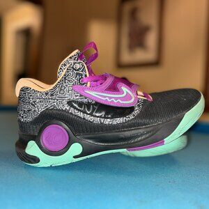 Elevate your streetwear with the Nike Timothy Goodman x KD Trey 5 X Brooklyn Courts Men's Sneakers. These mid-top sneakers feature a lace-up closure and a solid black color with a galaxy-inspired theme, making them the perfect choice for casual or activewear outfits. The mesh upper material, foam insole, and rubber outsole provide both comfort and performance, making them ideal for basketball and school activities. The Nike KD Trey 5 sneakers are part of the Nike product line and were manufactured in Vietnam in 2022, with a style code DD9538-013. They are not customized nor vintage and are not signed. These sneakers are perfect for those who want to add a colorful and sporty touch to their wardrobe.