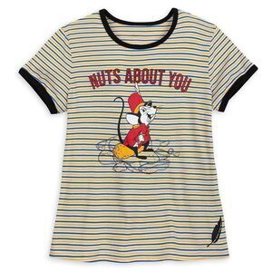 Step right up! You will be nuts about this glitter-accented striped top featuring Dumbo's fearless friend and helper, Timothy. The constrast scoop neckline and ringer sleeves add a vintage look to this soft, comfy t-shirt.