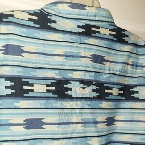 Stylish blue patterned button-up shirt with snap buttons. Features a unique geometric design. Long sleeve and lightweight. 100% cotton. Pre-owned and in great condition.