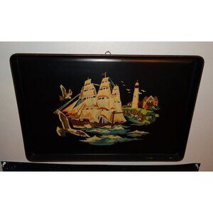 This lovely, vintage, hand painted tray is in the style of old French Tole pieces but was likely produced in the US, possibly by Nashco. The tray is a black colour with gold border decoration and features a hand painted sailing ship in front of a lighthouse in the center. This would be a great function piece for your home or a lovely piece of decor to accent a room or a boat. It comes with a small loop on one side so it can be hung on a wall hook.