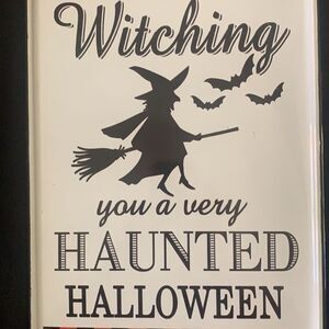 This cute tin sign is slightly distressed looking. Made to look like an old tin tray. It is in perfect unused condition. It has a hanger or you could prop it against something.
