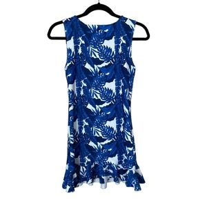 Tina + Jenna Leaf Print Dress XXS Ruffle Hem Sleeveless Blue White Vneck Mini