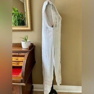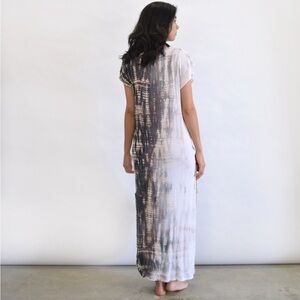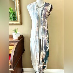 This tie dye Maxi Dress Long Vest from Tina + Jo, an Anthropologie brand, features a neutral white, cream, black, and gray tie-dye with a sleeveless / cap sleeve long line silhouette, v-neckline, button front, pleated detailing at the shoulders, and a subtle high low curved hem with high side slits. 100% rayon