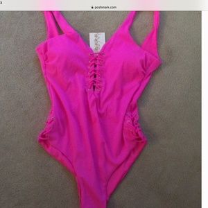 TiniBikini hot pink (hot bubblegum) ribbed one piece. Size M. Ribbed material lace up sides and front w gold rivets Scoops low in the back Super flattering. Removable cup padding. Preowned. Shows some signs of wear marks, scratches, chips, discoloration etc. See pictures.