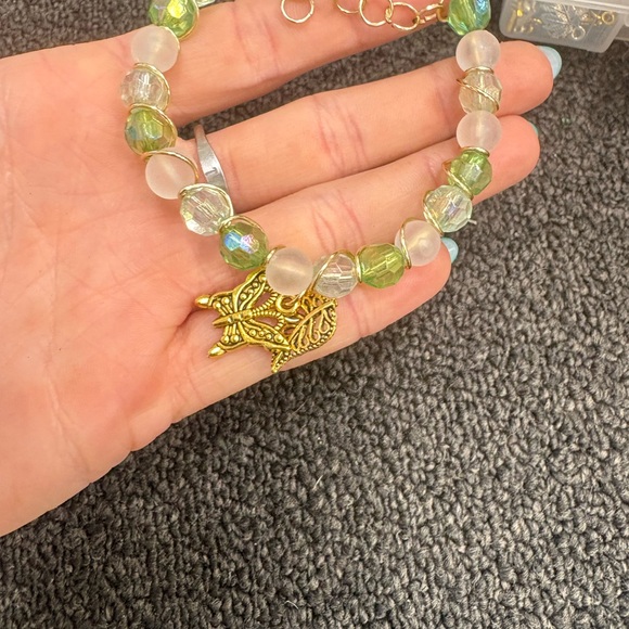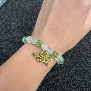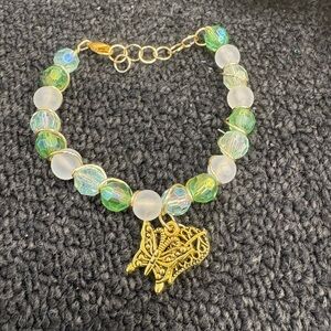 Tinkerbell themed beaded bracelet featuring light green and frosted beads. Gold-toned butterfly charm adds a whimsical focal point. Lightweight and adjustable for comfortable wear. Perfect for everyday styling and layering.