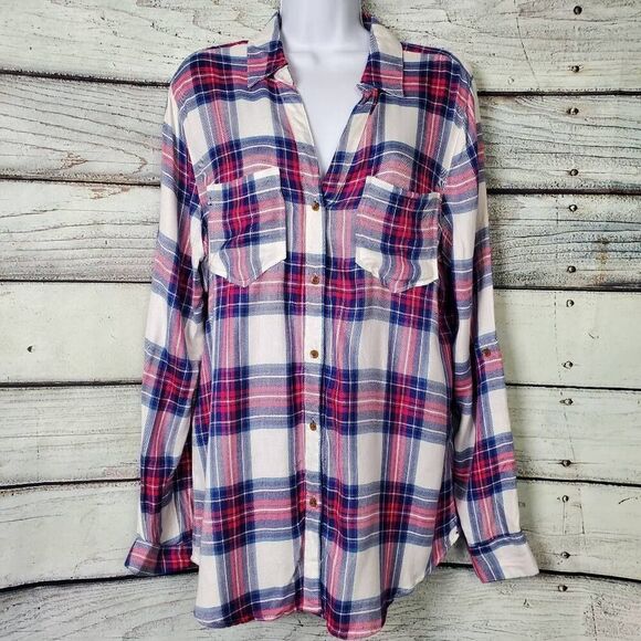 Tinsel women’s long sleeve button down shirt in pink, blue, and white plaid. Size Large. Features dual chest flap pockets, lightweight drapey fabric, and casual relaxed fit. Great for layering or everyday wear.