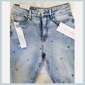Tinsel All Over Daisy Mom Jeans. Button front waist with zipper fly. Classic 5 pocket design. Destructed details. Embroidered butterflies throughout. Slim fit. Frayed hem. 99% cotton/1% spandex. Machine wash. These jeans are super cute on. They do fit smaller than the size. So be aware of that. Tinseltown Daisy Mom Jeans Size 5