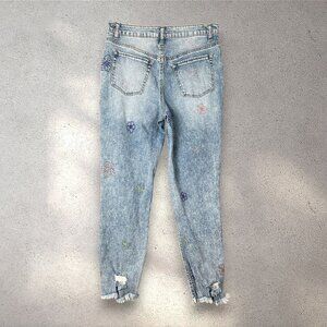 Light wash distressed jeans by Tinseltown featuring colorful floral embroidery and frayed hems for an artsy Y2K vibe. Mid-to-high rise fit with a relaxed, comfortable silhouette — perfect for casual days, school, or festival wear. Great preloved condition with minimal signs of wear! 🌸